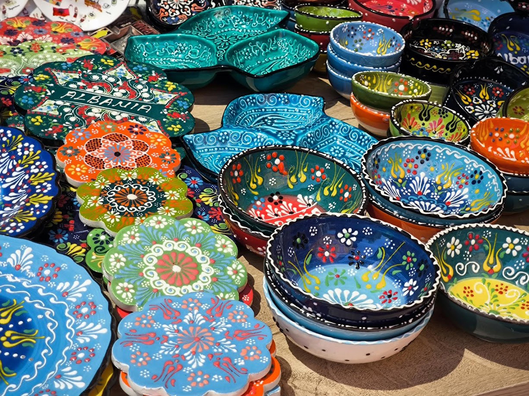 Mein Weg führt mich weiter in den Alten Bazar, ein farbenfrohes Viertel mit kleinen Läden, Cafés und Kunsthandwerk. Ich koste lokale Spezialitäten – süßes Baklava, frischen Schafskäse, eingelegte Paprika. Besonders beeindruckt mich die Gastfreundschaft der Menschen. Ein Lächeln hier, eine Einladung auf einen Raki dort – ich fühle mich willkommen. Lebendig geht es hier im Alten Bazar zu, wo Händler neben Obst, Gemüse und duftenden Gewürzen Kuriositäten aus Vergangenheit und Gegenwart feilbieten. Kommunistische Relikte, handgeschnitzte Holzpfeifen und sogar Pässe entdecke ich. Wer noch eine zweite Identität sucht, scheint hier fündig zu werden, schmunzle ich. Rund um den kuriosen Markt sprießen hippe Cafés und Galerien. Ich probiere „Tavë Kosi“, ein herzhaftes Lamm-Joghurt-Auflaufgericht, und lasse mich von der Mischung aus Alt und Neu überraschen. Wie gut, dass direkt in der Nähe des Marktes eines der beliebtesten Traditions-Restaurants der Stadt liegt. Bodenständiges Essen und stimmungsvolle Livemusik runden das Flair der heimeligen Folklore ab.