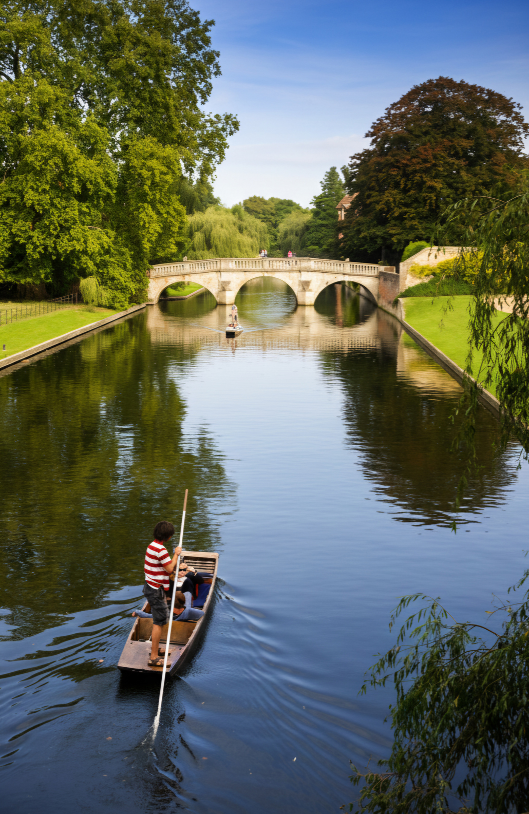 Ein Cambridge-Besuch ohne Punting ist wie Tee ohne Scones – möglich, aber sinnlos. Die Fahrt im Stechkahn gehört zur Stadt wie die Colleges selbst. Auf dem River Cam gleiten die Boote dahin, gelenkt von Bootsführern, die mit ihren langen Stangen fast so lässig wirken wie venezianische Gondolieri – nur mit britischem Understatement und wetterfesterer Kleidung. Vom Wasser aus zeigt sich Cambridge von seiner poetischsten Seite: Weiden neigen sich über den Fluss, die Colleges spiegeln sich im Wasser, und die Stadt scheint für einen Moment in einem eigenen Rhythmus zu schwingen.