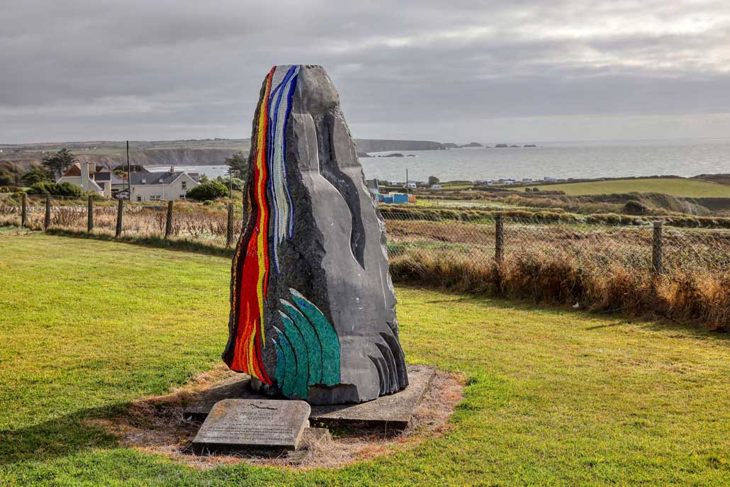 Das Kunstobjekt „Fire & Ice“ markiert den Aussichtspunkt Dunabrattin Head oberhalb der Copper Coast und symbolisiert die Entstehung der Erde. – Foto: Udo Haafke / Mortimer Reisemagazin