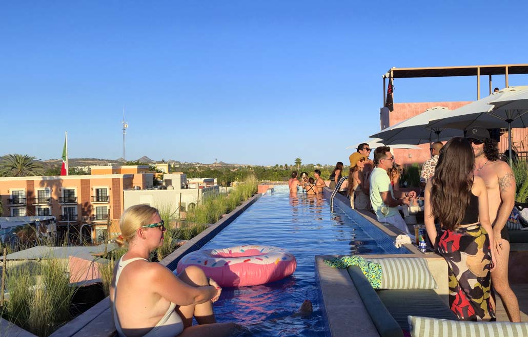 Ein Herzstück des Hauses ist der zwischen den hohen Wänden gelegene, schmale Innenhof, der als Treffpunkt und schattige Sitzgelegenheit dient, aber gerne auch als Veranstaltungsfläche etwa für Yoga-Sessions genutzt wird. Ein weiterer Schlüsselbereich ist die Dachterrasse mit einem langen, schmalen Infinity Pool , dessen gläserne Kante fast mit dem Horizont zu verschmelzen scheint. Von hier fällt der Blick auf die Türme der Kirche Misión San José del Cabo und den Turm des Verwaltungsgebäudes.