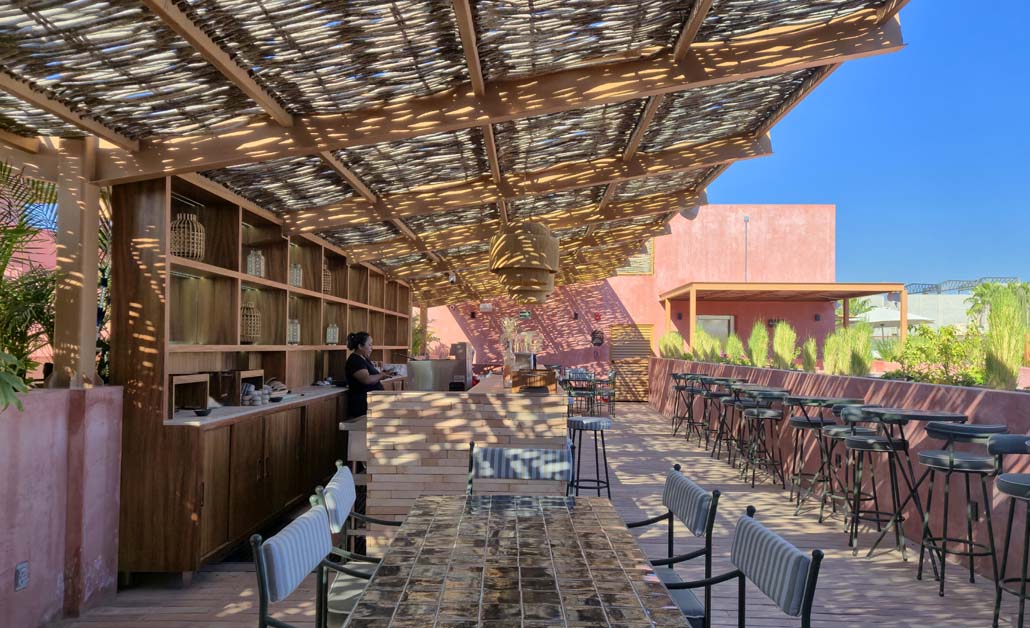 Ergänzt wird die Dachterrasse durch einen Barbereich mit entsprechenden Sitzgelegenheiten. Deren dunkles Grün korrespondiert perfekt mit dem dominanten Altrosa. Gerne wird der Bereich um die Rooftop-Bar auch als Partylocation genutzt. Hier treffen sich dann gleichermaßen Gäste und Einheimische, um zu DJ-Musik abzutanzen.