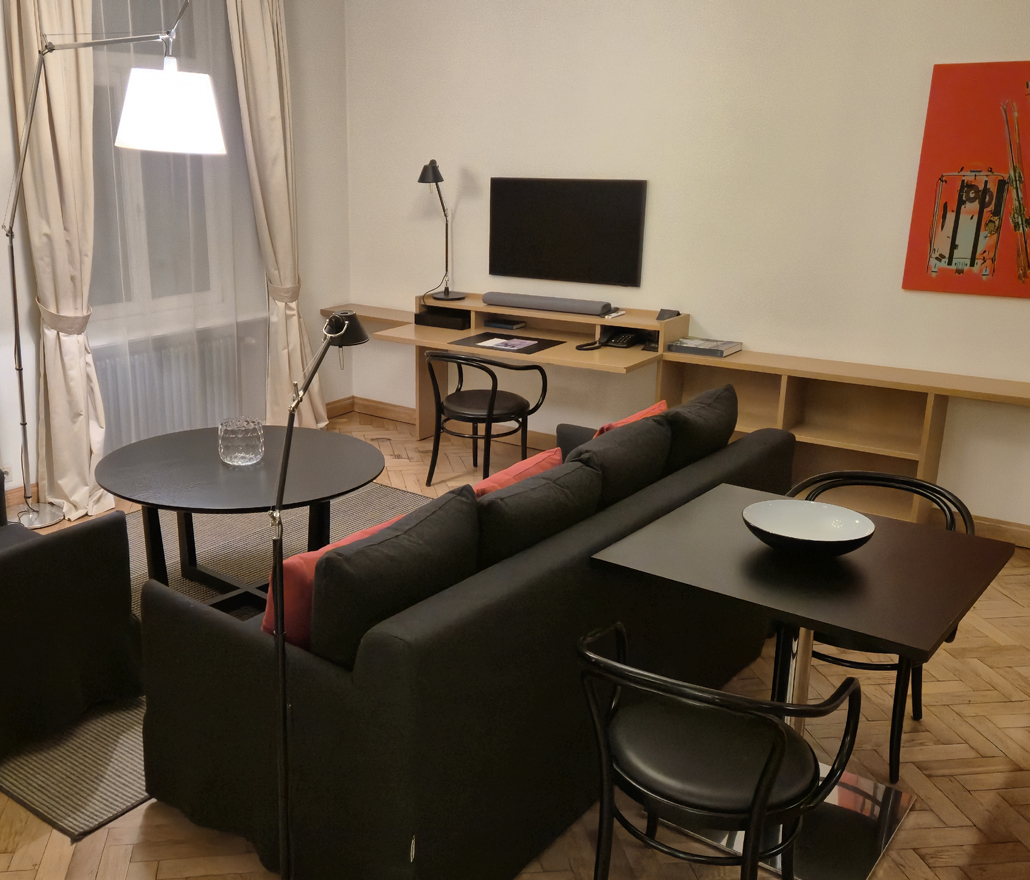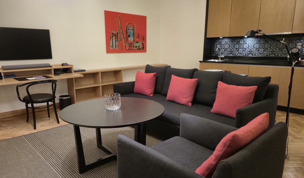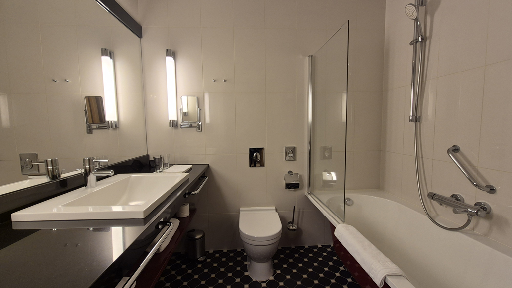 Wirklich großartig – im wahrsten Sinne des Wortes – sind die Apartment-ähnlichen Suiten. Der erste Blick fällt auf das, für Hotelverhältnisse, riesige Wohnzimmer. Nicht nur ein Sofa, sondern auch zwei große Sessel in schwarz gehalten laden zum Entspannen ein.