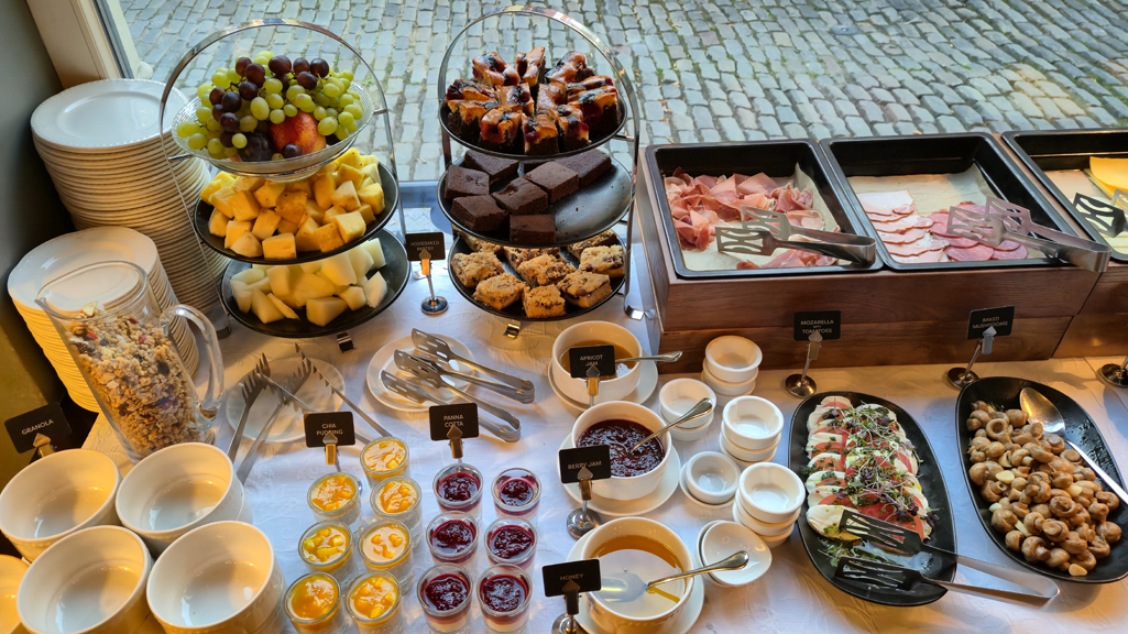 Nicht nur die Aussicht auf die alten Straßen und Gebäude Rigas ist großartig. Auch die frisch zubereitete Auswahl an warmen und kalten Speisen lässt keine Wünsche offen. Handelt es sich im Neiburgs Hotel doch schon fast um einen Brunch.