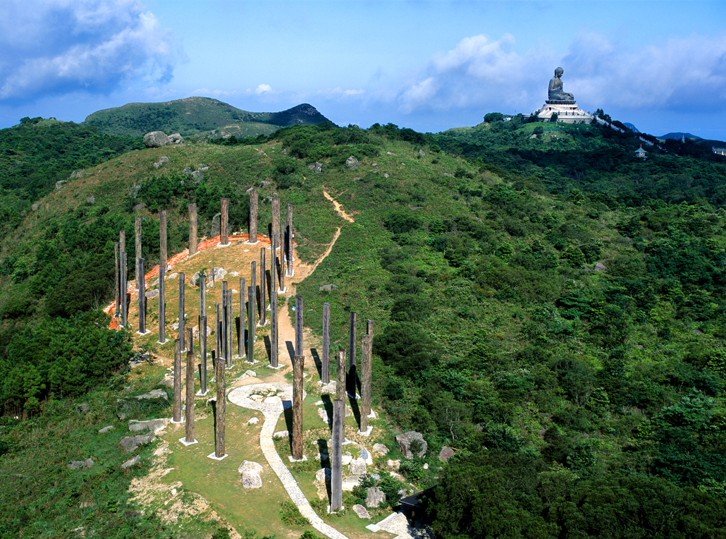 Oben angekommen lässt sich nicht nur das Ngong Ping Plateau überblicken, sondern auch die neue Hong Kong-Zhuhai-Macao-Brücke und die Innenstadt von Tung Chung. Auch der Flughafen ist von hier zu sehen. Bald schließt sich der Wisdom Path an. Ein Pfad mit 38 Holzsteelen, die zwischen acht und zehn Meter hoch sind und das Herz-Sutra, eines der bekanntesten Gebete der Welt, wiedergeben. Über den Shek Pik Country Trail geht es nun mit weiteren Ausblicken auf Wisdom Path und Big Buddha Richtung Süden, vorbei am gleichnamigen Stausee. Hier finden sich über 3.000 Jahre alte Felszeichnungen. Die quadratischen und runden Spiralen sind auch typisch für alte chinesische Handwerkskunst.