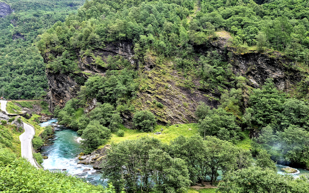 Zunächst fällt der Blick auf die schmucke Holzkirche von Flåm, die aus dem Jahre 1670 datiert. Nach dem ersten Tunnel dominiert mit dem Rjoandefossen ein erster, 241 Meter hoher Wasserfall mit drei Hauptstufen, deren größte eine Fallhöhe von 140 Metern misst, das Panorama. Die talwärts stürzende Wassermenge mit bis zu drei Kubikmetern pro Sekunde sorgt für ein ohrenbetäubendes Geräusch.