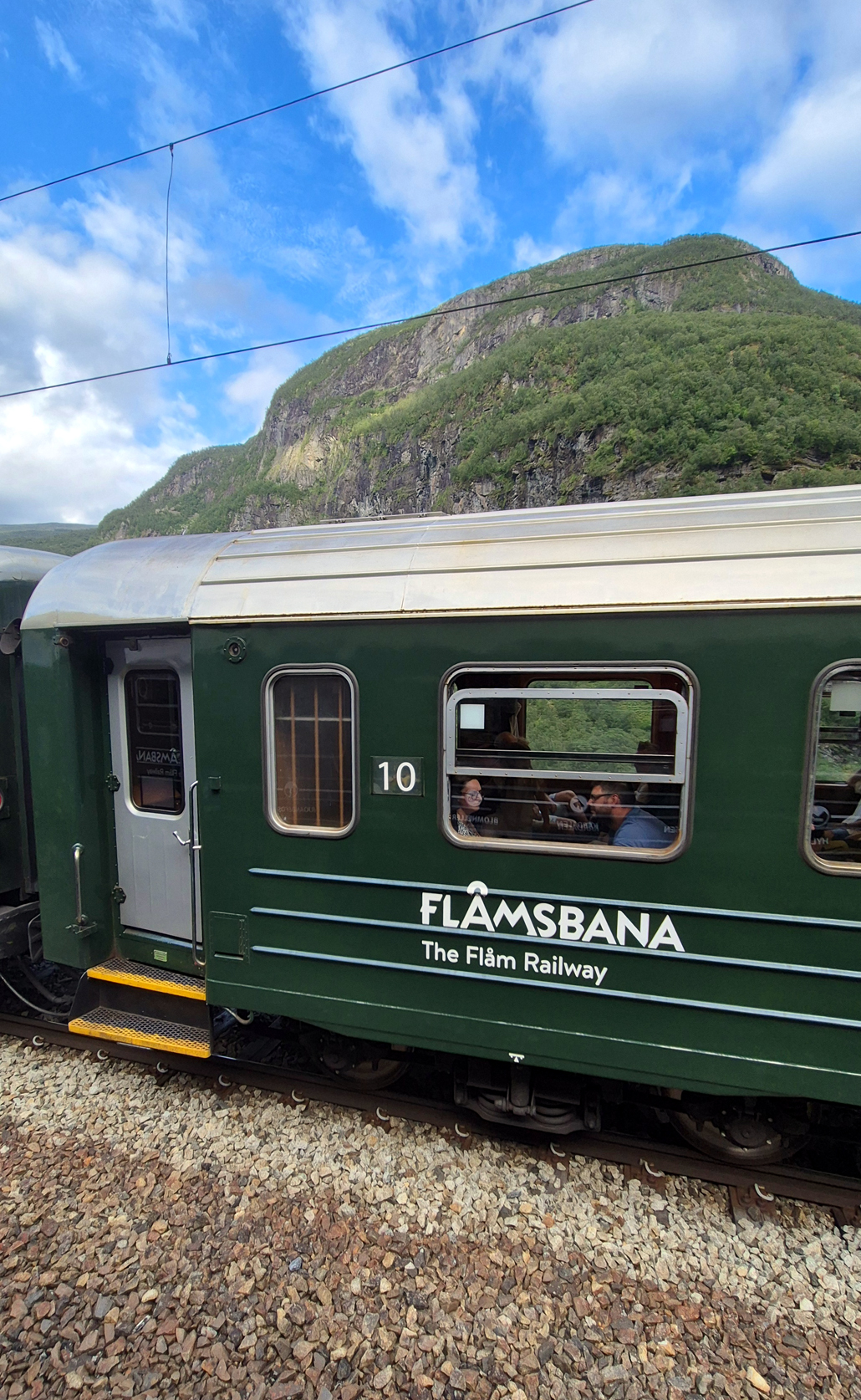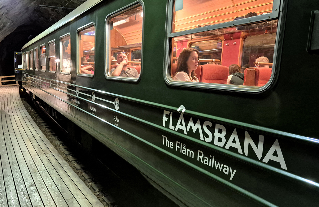 Mit den markant dunkelgrünen Waggons windet sich die „Flåmsbana“, wie sie auf Norwegisch heißt, von 450-Seelen-Nest Flåm aus über 20 Kilometer durch exakt 20 Tunnel bis nach Myrdal und bewältigt dabei 866 Höhenmeter. Der Zug tuckert mit gerade einmal knapp 40 Stundenkilometern eher gemächlich durch Tunnel, Täler und an Wasserfällen vorbei, als wolle er sicherstellen, dass wirklich jeder Passagier genug Zeit zum Staunen hat.