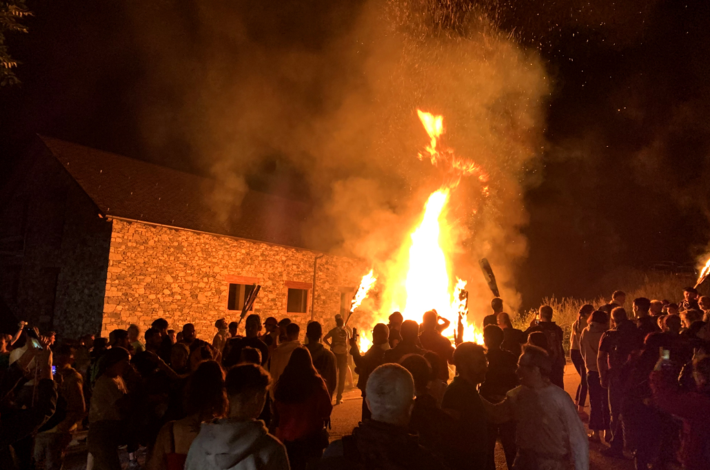 Maria Farré, in ihrem sportlichen Wanderoutfit, erklärt weiter: „Mindestens eine Woche vorher wird die Feuerstelle oben am Berg vorbereitet. Restholz vom Vorjahr wird mit einigen, neuen Baumstämmen zu einem riesigen, brennbaren Baum zusammen gestellt.“ Dann erzählt sie, mit einem Grinsen im Gesicht weiter: „Früher hat man auch mal die vorbereite Feuerstelle des Nachbardorfes eine Nacht vorher angezündet! Das war sehr unschön für die Leute. Es musste alles innerhalb eines Tages wieder neu aufgerichtet werden,“ und Maria ergänzt immer noch verschmitzt lächelnd „heute machen wir das aber nicht mehr.“