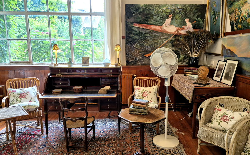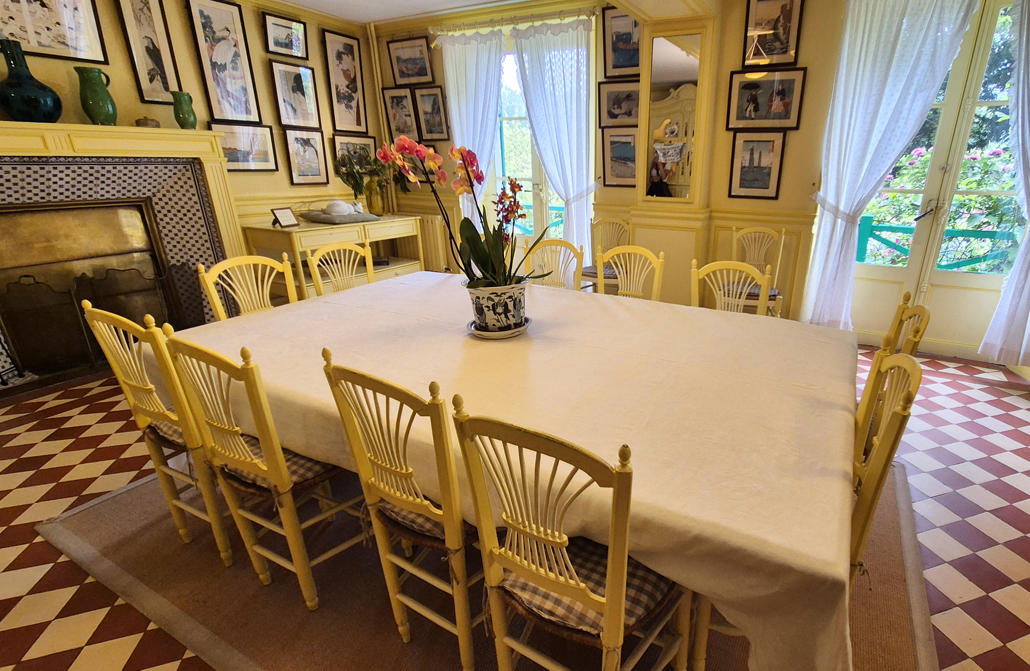 Auch das pastellfarbene, mit Efeu bewachsene Wohnhaus sorgt für manche farbliche Ausrufezeichen. So ist das Esszimmer in einem ungewöhnlichen Gelbton gehalten. Doch dies ist beileibe nicht der einzige Blick in das Privatleben von Claude Monet, der hier gewährt wird. Hinzu kommen ein Atelier, das angesichts der vielen Bildmotive aus allen Nähten platzt, und eine Sammlung japanischer Holzschnitte, die Zeugnis von Monets Faszination für den Fernen Osten ablegt.