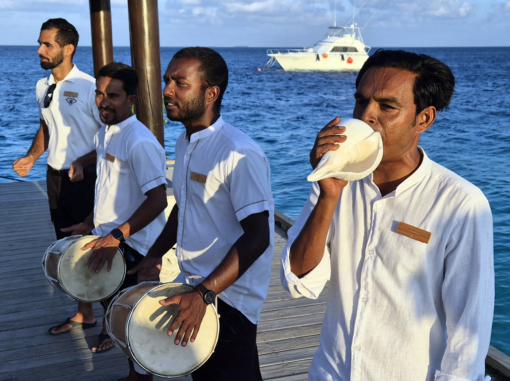 „Willkommen im Paradies“, trällert dann auch Resort-Manager Leroy Colin Dias fröhlich, nachdem der Katamaran am Pier festgemacht hat. Mit Trommelmusik und Klängen aus dem Muschelhorn werden die Gäste stimmungsvoll von einer Phalanx an Mitarbeitern in Empfang genommen. Hibiskus-Blüten werden geworfen und den Neuankömmlingen eine Kette mit einem Stern aus Palmenblättern um den Hals gelegt, während das aufmerksame Personal zur Begrüßung wahlweise Champagner oder eine frische Kokosnuss reicht.