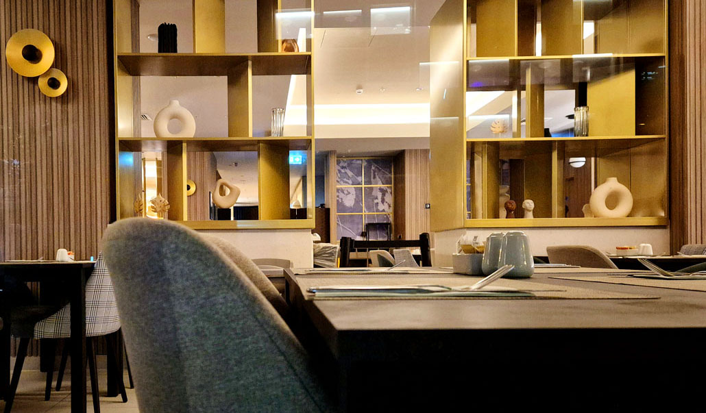 Das in dezenten Farben gehaltene Restaurant bietet reichlich Platz, besticht dabei durch großzügige Gänge, was sich insbesondere während der Stoßzeiten beim Frühstück positiv auswirkt. Selbst wenn die meisten Gäste gleichzeitig die erste Mahlzeit des Tages genießen wollen und sich am Büffet bedienen, herrscht keinerlei drangvolle Enge.