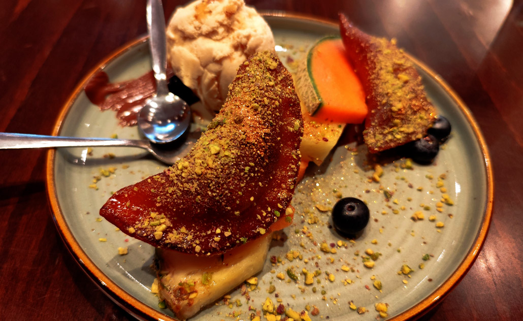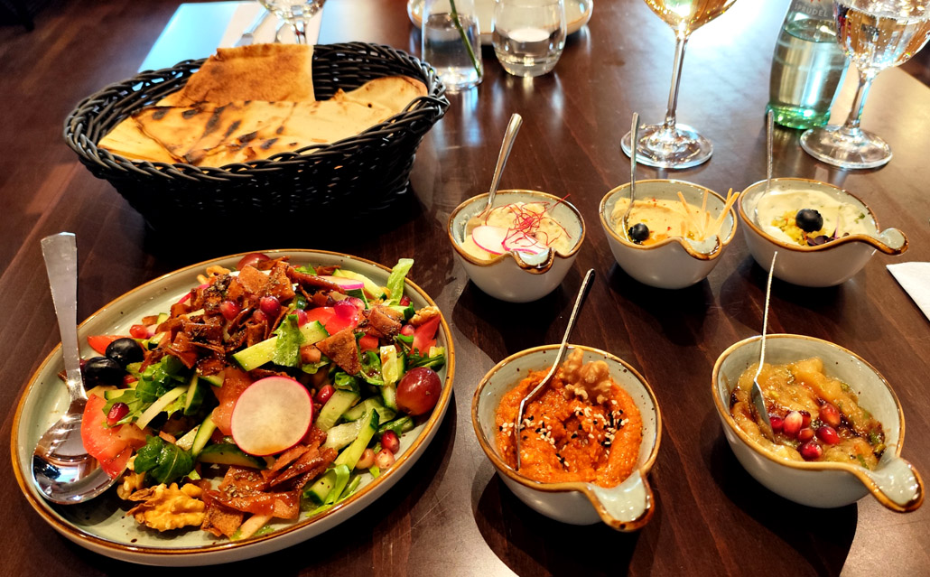 Fantstisch sind die raffinierten Mezze-Variationen. Bei der „Vorspeisenkarawane“ werden verschiedene arabische Vorspeisen kunstvoll zusammengestellt und sind ein Fest für Auge und Gaumen. Wahrlich ein arabischer Traum sind auch die Bulgur-Fleischbällchen mit siebenerlei arabischen Gewürzen und Joghurtsauce. Und dann zum krönenden Abschluss als Dessert Atayef Gos: ein köstlicher süßer Pfannkuchen gefüllt mit Walnüssen, Kokos und Rosenwasser mit Walnusseis und mit Pistazien garniert.