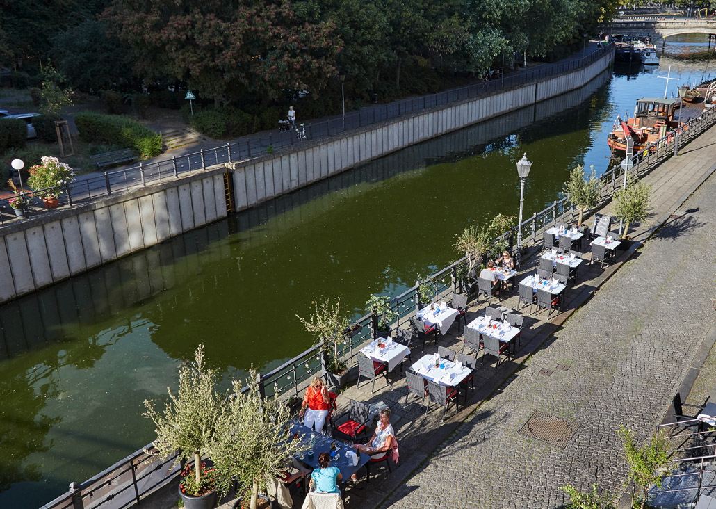 Im Sommer kann man die Spezialitäten des „Cana“ auch direkt vor dessen Haustür an der Spree genießen. – Foto: Living Hotels