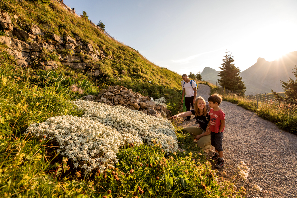 Hier können Eltern und Kinder gleichzeitig in der Natur spazieren, die Alpenflora entdecken und sich an der Aussicht erfreuen. Und nach der Wanderung wartet Alpenspielplatz auf die kleinen Entdecker, die hier spielen, balancieren, rutschen und klettern können.