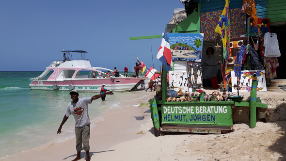 „Der hat sowieso zu viel Gräten“, konstatiert Jorge, bevor er wenig später unweit des Strandes ankert. Mit einem kleinen Boot geht es zurück an die Playa de Bávaro. Mit etwas wackeligen Knien folgt ein Spaziergang in das kleine Dörfchen neben dem Royal Suites Turquesa. An den Straßen werden von fliegenden Händlern neben Kitsch und Souvenirs vor allem Ananas, Kokosnüsse, Bananen und andere Südfrüchte feilgeboten. Aber auch der beliebte Quso d hoja. Dies ist ein Kuhmilchkäse, der an eine Mischung aus Mozarella und Halumi erinnert. Ein dicker Pappteller voll kostet gerade einmal 100 Pesos, was etwa 1,95 Euro entspricht.