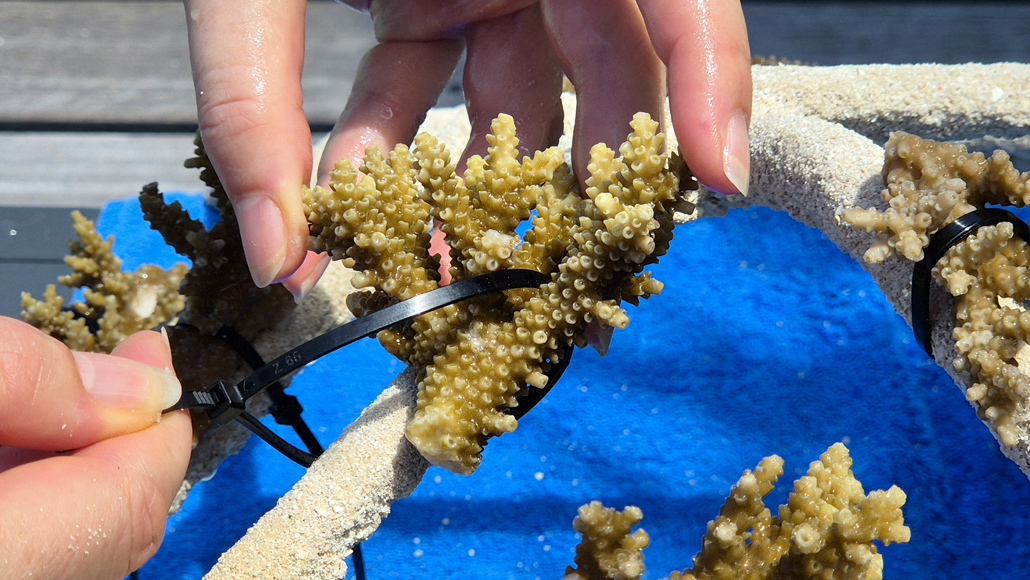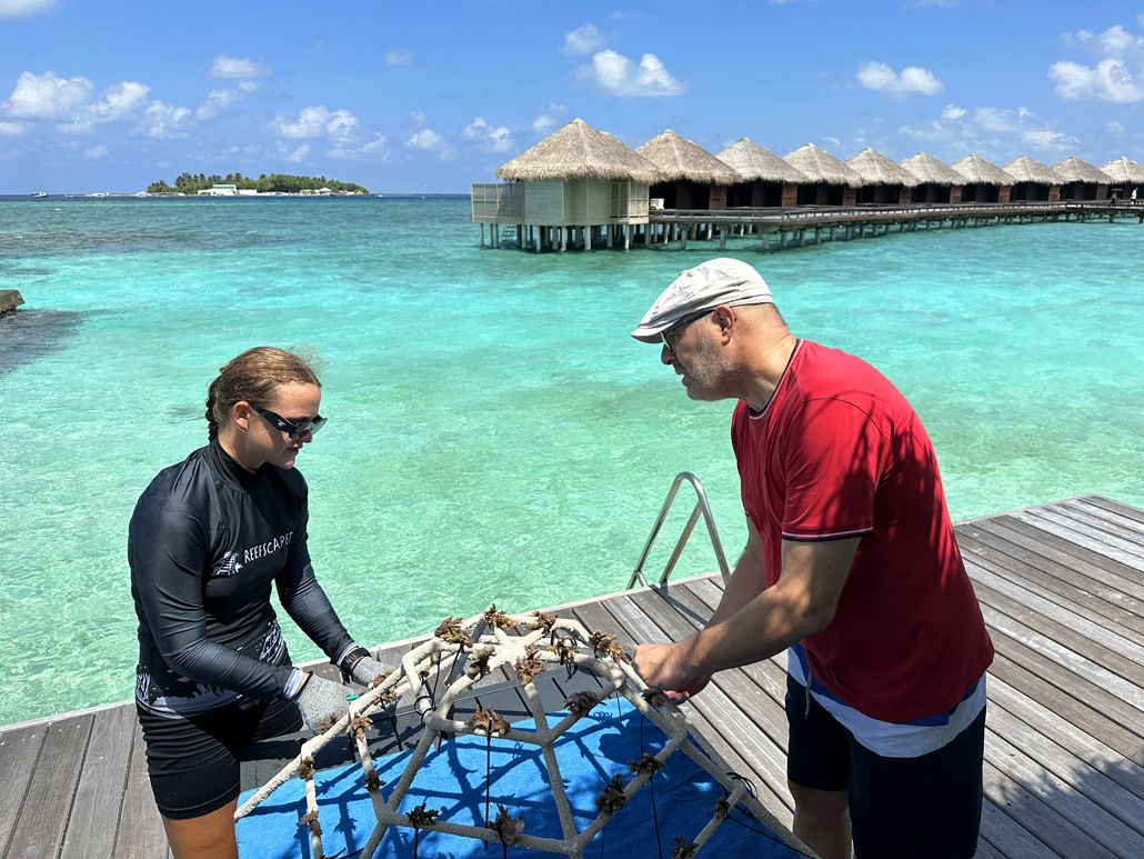 Meeresbiologin Cailin Roberts hilft im Sheraton Maledives Full Moon Resort beim Befestigen der Korallen. – Foto: Susanne Timmann / Mortimer Reisemagazin