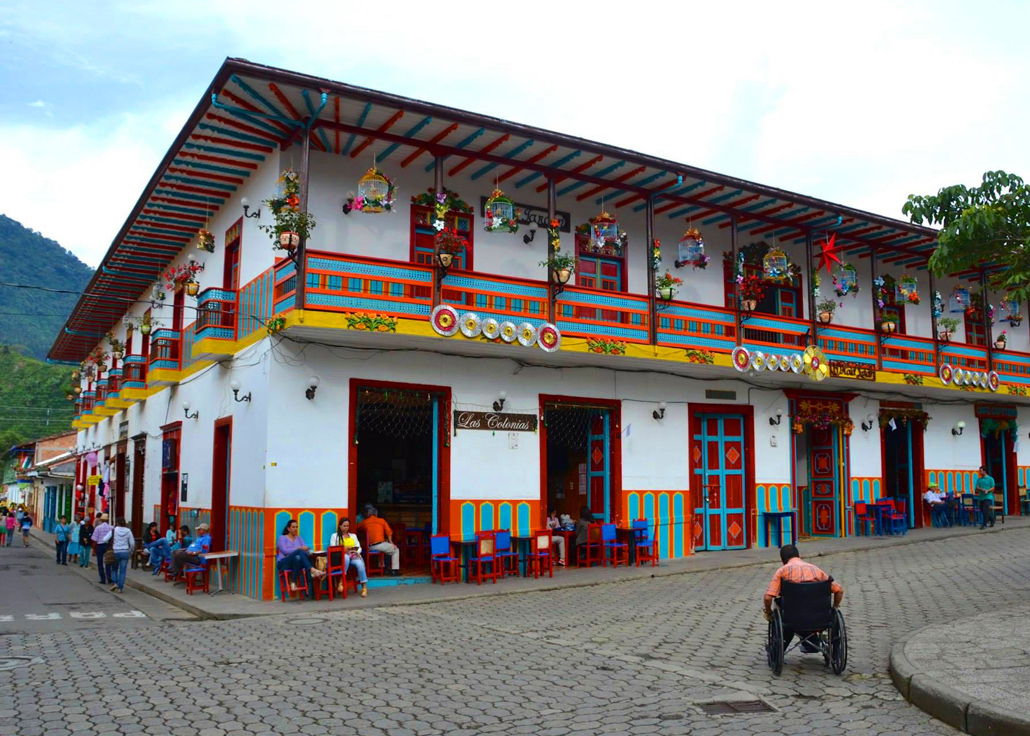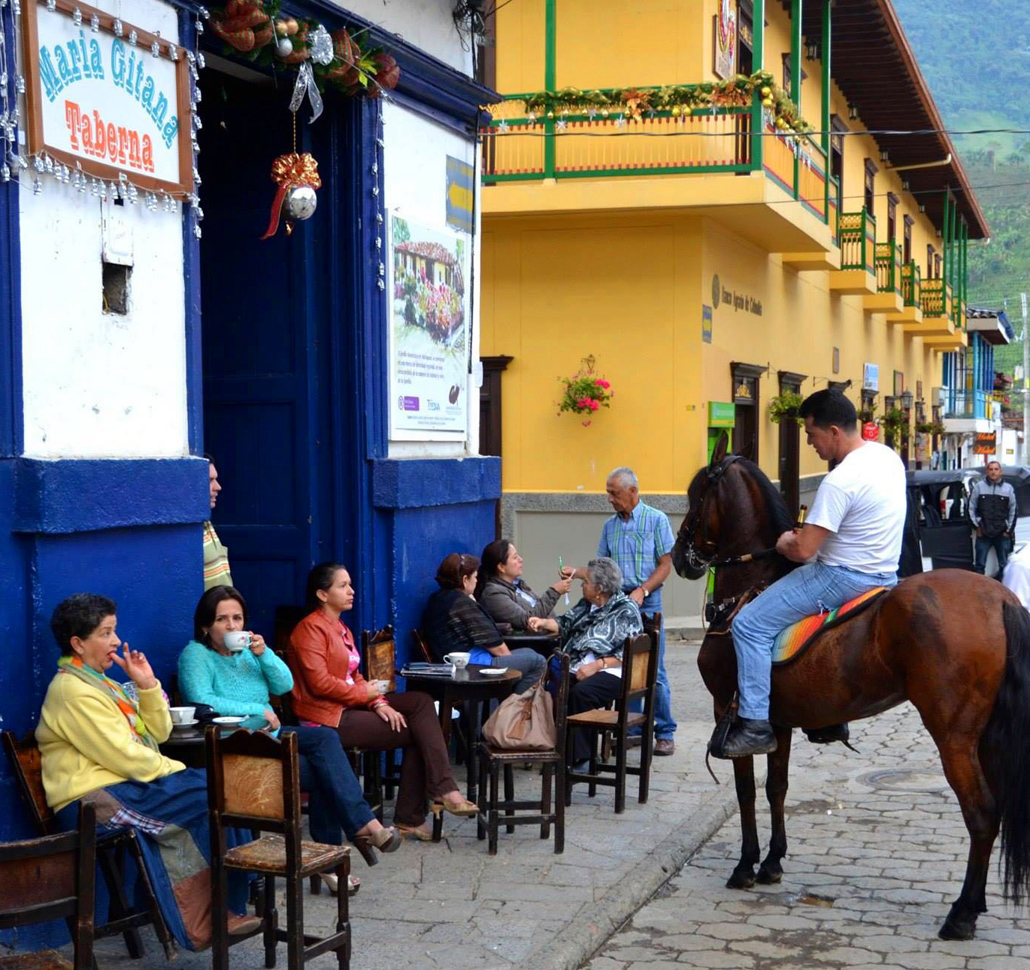 In Jardin angekommen, steht bei vielen Gästen in einer der vielen Bars rings um den Marktplatz eine Flasche des Getränks auf dem Tisch. Ein liebenswürdiger Ort, der fast wie eine Filmkulisse wirkt. Wären da nicht die erwähnten vielen Bars aus denen Musik hallt, dutzende Menschen dafür, manchen reiten einfach mit ihrem Pferd zum Bestellen, auf dem Platz bieten Händler das Obst der Region und allerlei Garküchen laden zu probieren. Farbenfroh reihen sich die Häuser um den Platz. Lateinamerika wie aus dem Bilderbuch.