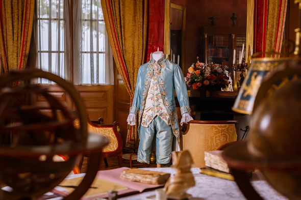 Zarte, roséfarbene Blütenblätter fallen auf kostbare Stoffe hinab und hüllen sie in ein duftiges Blütenmeer. Behutsam applizierte Volants klettern wie schlanke Blütenranken den Rocksaum empor, unter welchem sich ein ausladender Reifrock wölbt. Blumiges zeigt sich aber auch an opulent bestickter Herrengarderobe: Hier etwa prangen üppige Bouquets aus Brokat am Revers.