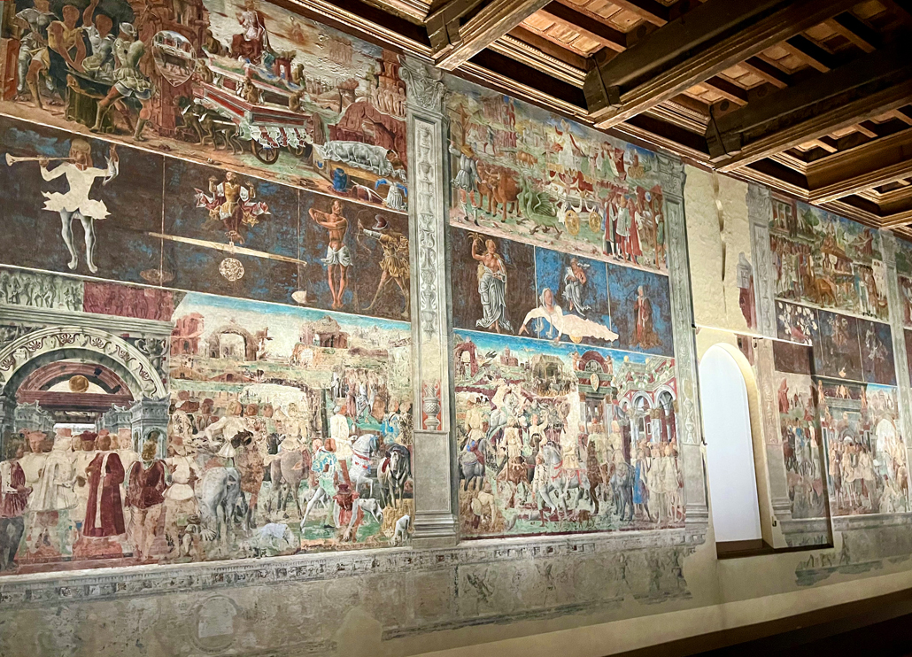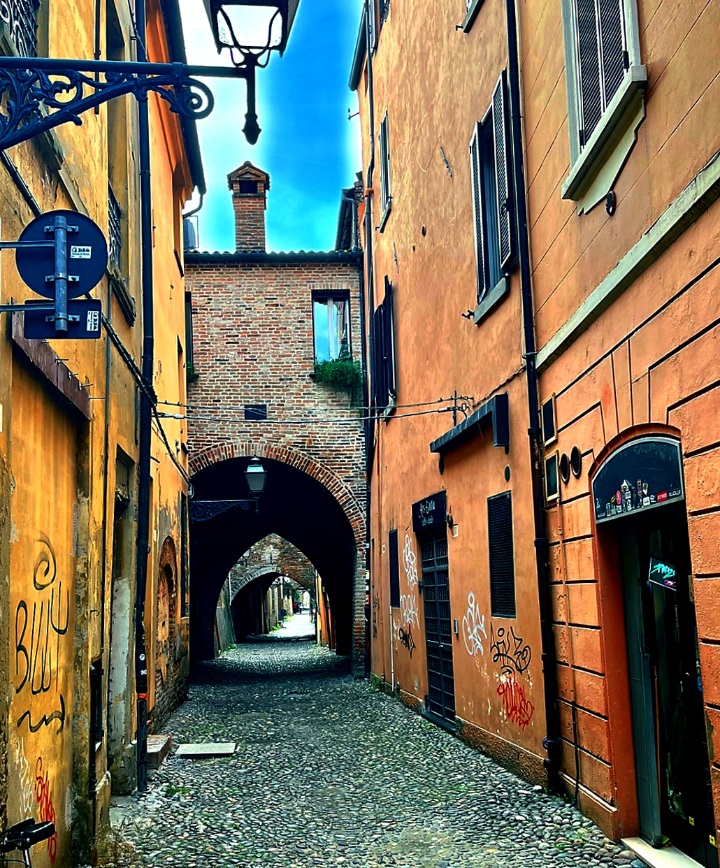 Im Palazzo Schifanoia können alte Wandmalereien bewundert werden, in den Gassen der Altstadt schließt man die Augen und wähnt sich im Mittelalter und der Renaissance. Vieles ist so wie es immer war. Eien Stadt als Museum. Dabei ist Ferrara eine lebendige Stadt und die alten Plätze und Bauten werden durchaus für mehr als nur Geschichtsbetrachtung genutzt. Der Hof den Castells etwa für Technopartys. Vorteil durch die dicken Mauern dringt kaum Lärm nach draußen in die Stadt.