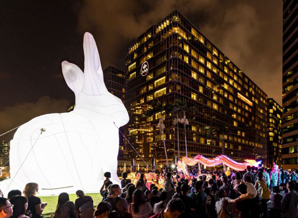 Zehn riesige, illuminierte weiße Hasen der Künstlerin Amanda Parer erhellen derzeit das nächtliche Hongkong. Anlass ist das Mid-Autumn-Festival, das noch bis zum 17. Oktober in der asiatischen Metropole gefeiert wird. Das traditionelle chinesische Lichterfest gehört zu den größten Veranstaltungen im städtischen Eventkalender. Die bis zu sieben Meter großen Hasen der „Moon Rabbit Lumiere“ stehen unter anderem an der Lee Tung Avenue in Wan Chai auf Hong Kong Island, die von mehr als 800 Laternen erhellt wird.