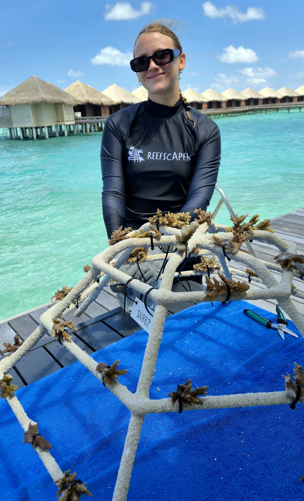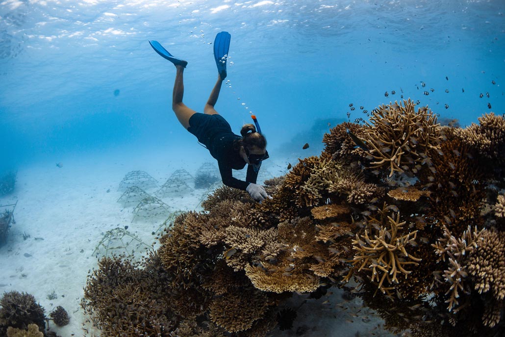 Gemeinsam mit der Meeresschutzorganisation Reefscapers und mit tatkräftiger Unterstützung der Gäste setzt sie sich tagein, tagaus mit Hingabe für die Wiederherstellung der Korallenriffe ein. Unter ihrer Anleitung befestigen umweltbewusste Urlauber kleine Korallenfragmente an rostfreien, gesandeten Rahmen, die eigens auf einer Insel im Baa-Atoll gefertigt werden. Anschließend werden die Rahmen in den flachen Lagunen oder direkt am Riff vor dem Resort platziert.