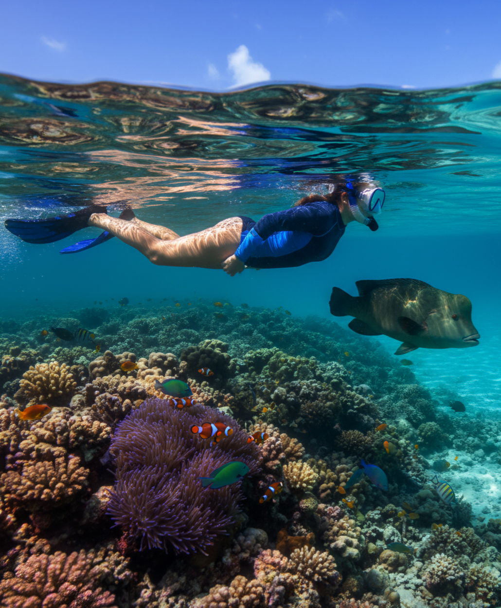 Natürlich gehören die Schnorcheltouren in der Lagune und zum Riff zu den Höhepunkten für alle, die sich der Faszination diese bunten Unterwasserkaleidoskops nicht entziehen können. Da tummeln sich Papageien-, Doktor-, Clown- und Schmetterlingsfische, aber auch Muränen und Kugelfische sowie größere Arten wie Napoleon-Lippfische, Barrakudas, Thunfische, Schnapper, Riesenmakrelen und majestätische Mantarochen. Hinzu kommen seltene Meeresschildkröten.