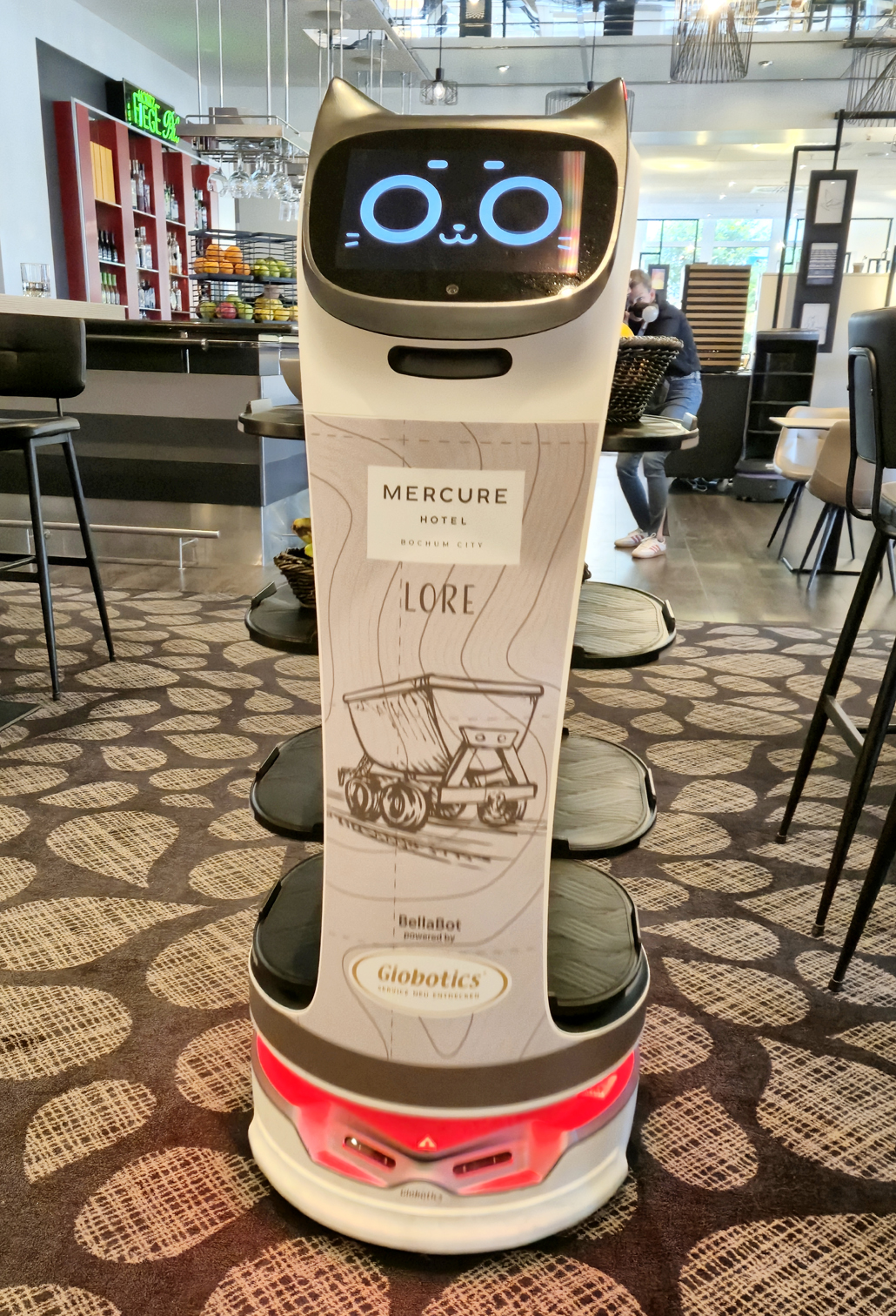 Mit „Lore“, dessen Name an die Bochumer Bergbauhistorie erinnert, rollt ein weiterer Service-Roboter mit kleinen Leckereien durch den Gastro- und Lobbybereich. Lore hat nicht nur dank seines Namens eine menschliche Note. Der Roboter kommuniziert extrem höflich mit sanfter Stimme mit dem Gast und kann auf Wunsch sogar „Happy Birthday“ intonieren.