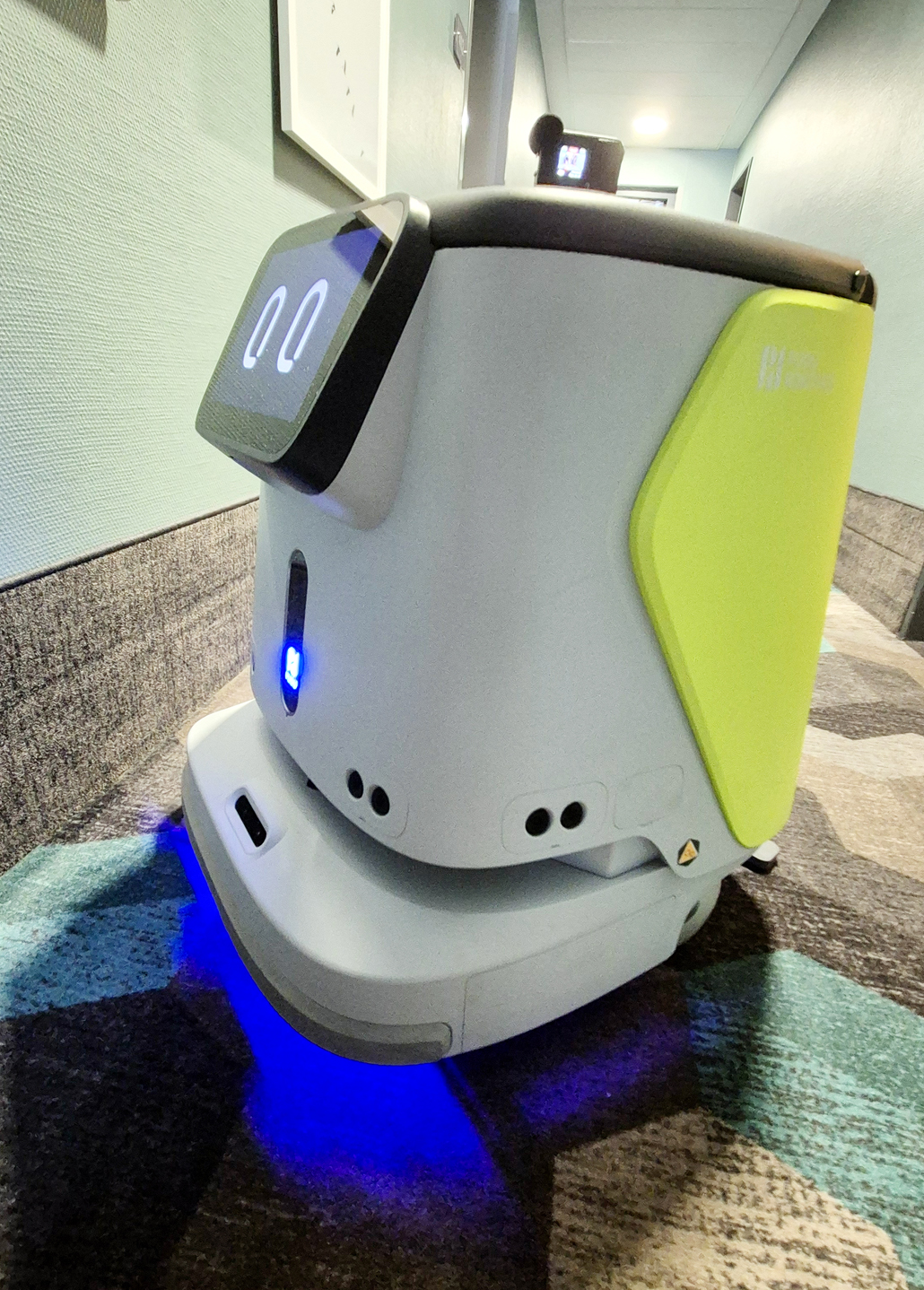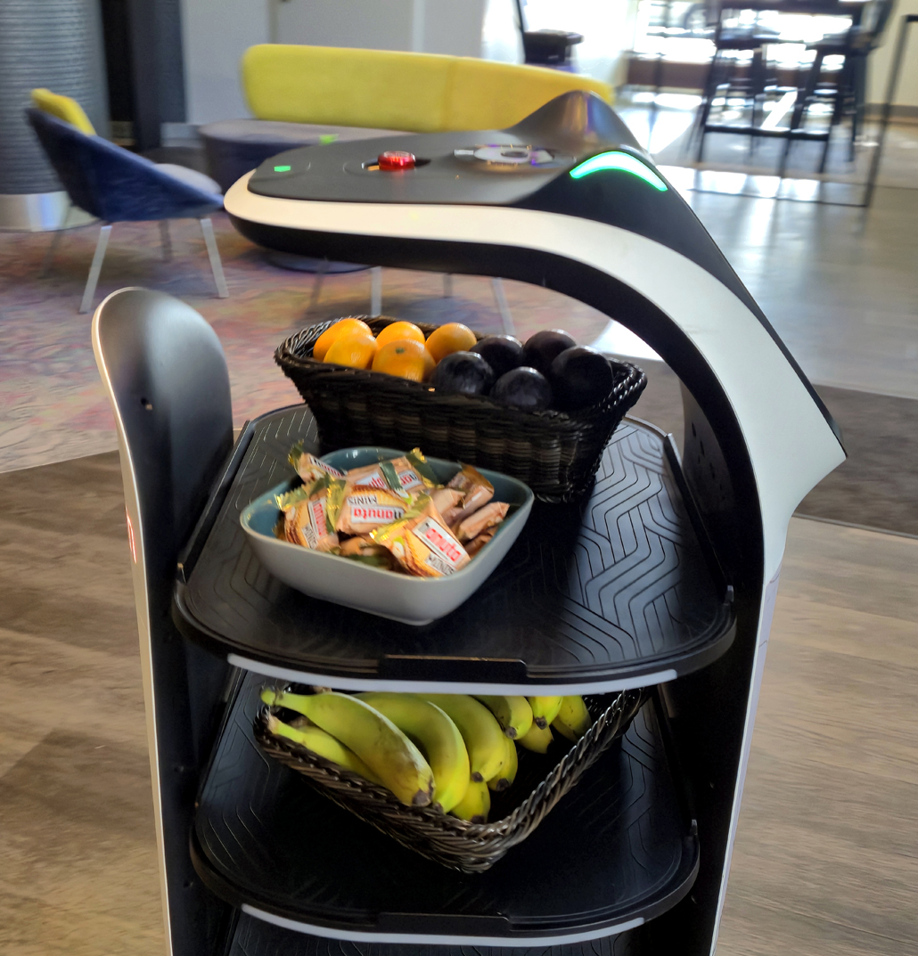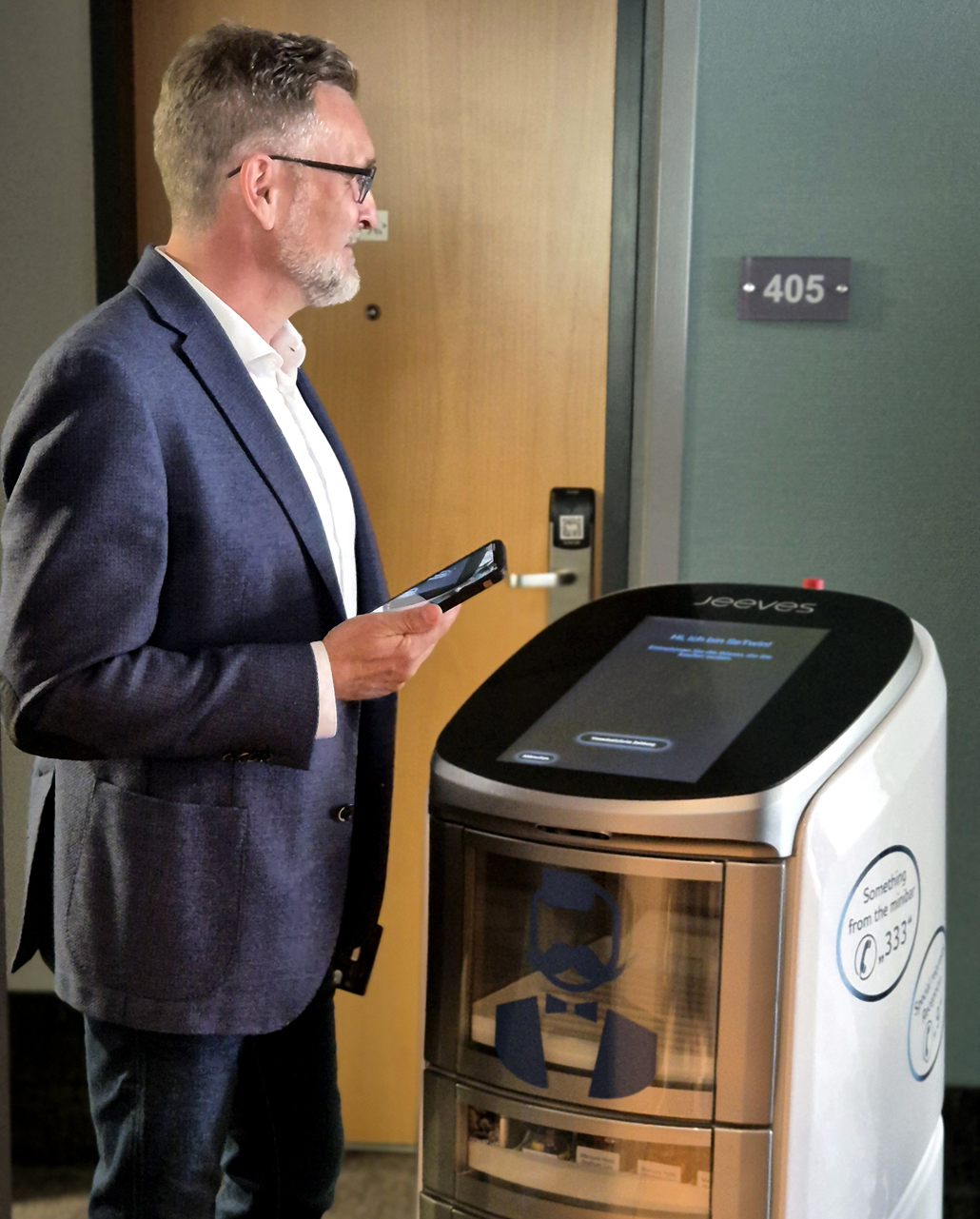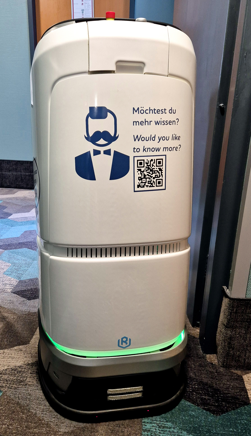 Rund um die Uhr liefert sein Kollege „Jeeves“ als Minibar-Roboter Snacks, Getränke, kleine Mahlzeiten oder Hygieneartikel direkt bis an die Zimmertür. Dabei navigiert das Gerät völlig selbständig durch das Hotel, nutzt den Fahrstuhl und findet ohne Unterstützung das Zimmer des Bestellers. Geordert werden kann über einen im Zimmer abrufbaren QR-Code oder per Haustelefon. Unter der Rufnummer 333 wird der Gast direkt mit Jeeves verbunden und kann seine Bestellung aufgeben.