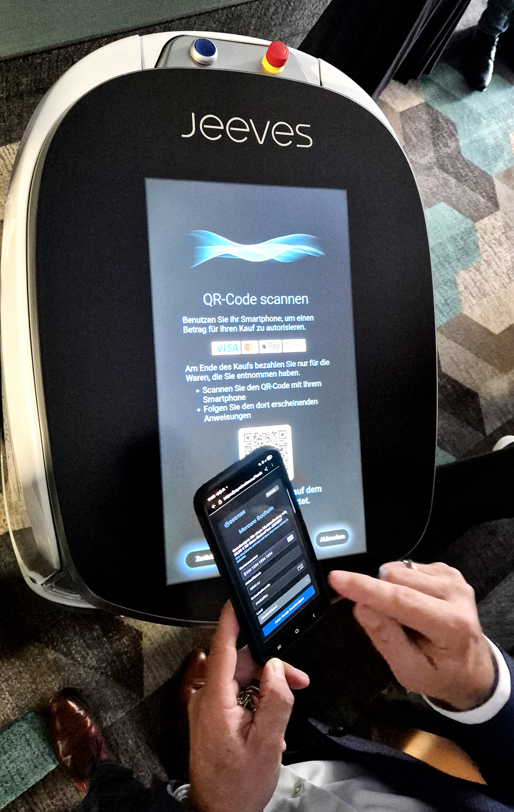 „Alle georderten Waren müssen am jeweiligen Roboter direkt per Karte bezahlt werden“, erläutert André Wagner das System. Die Lieferzeit variiert naturgemäß abhängig von der Zahl der eingegangenen Bestellungen. Im Idealfall benötigt Jeeves lediglich drei Minuten von der Lobby bis zum jeweiligen Zimmer in dem 14-stöckigen Hotelkomplex.