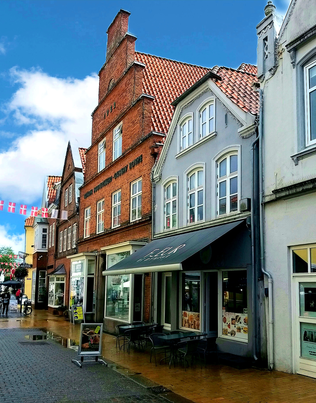 Die Altstadt von Tønder gehört zu den ältesten Dänemarks. Hier regiert nicht der Prunk der Metropolen, sondern die Beständigkeit des Backsteins. Rund um den Marktplatz gruppieren sich das Alte Rathaus und die Kristkirke. Die Storegade, die zentrale Achse, präsentiert sich mit Kaufmannshäusern aus dem 17. und 18. Jahrhundert, deren Fassaden von Wohlstand und Handwerkstradition zeugen. Viele Gebäude sind sorgfältig restauriert. Die Straßen sind schmal, das Kopfsteinpflaster unregelmäßig, und ein Blick auf Türen, Fensterrahmen und Giebel verrät viel über die Menschen, die hier einst lebten. Besonders auffällig ist die Liebe zum Detail. Manche Türen sind kunstvoll verziert, manche Fenster tragen alte Inschriften, und an vielen Häusern finden sich kleine Ornamente, die einst Statussymbole waren.