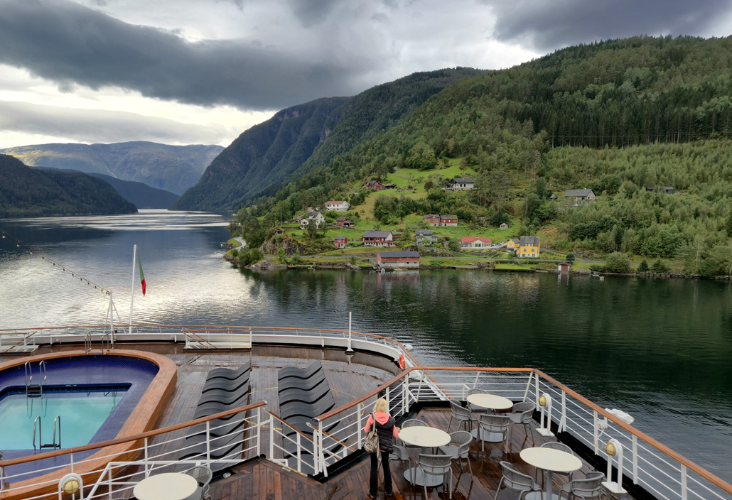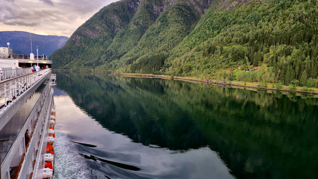 Was sich auch ergibt, sind immer wieder entzückende Aussichten auf den Fjord, die liebliche Landschaft und die stolze Vasco da Gama, die ruhig auf dem Wasser liegt und den Eindruck macht, als würde sie auch die Unaufgeregtheit dieses Ortes einfach nur genießen.