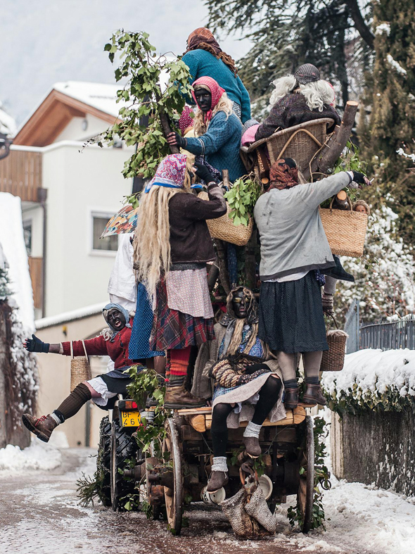 Burgltreibern, Altweible und anderen phantasievollen Gestalten zieht er mit seiner Braut durch die Straßen und sagt dem Winter Adieu. Nicht weniger ungewöhnlich als die Figuren: In Tramin regnet es nicht „Kamelle“, sondern Heublumen, Sägespäne, Staub oder Konfetti. Insgesamt nehmen über 30 Gruppen an dem Spektakel teil.